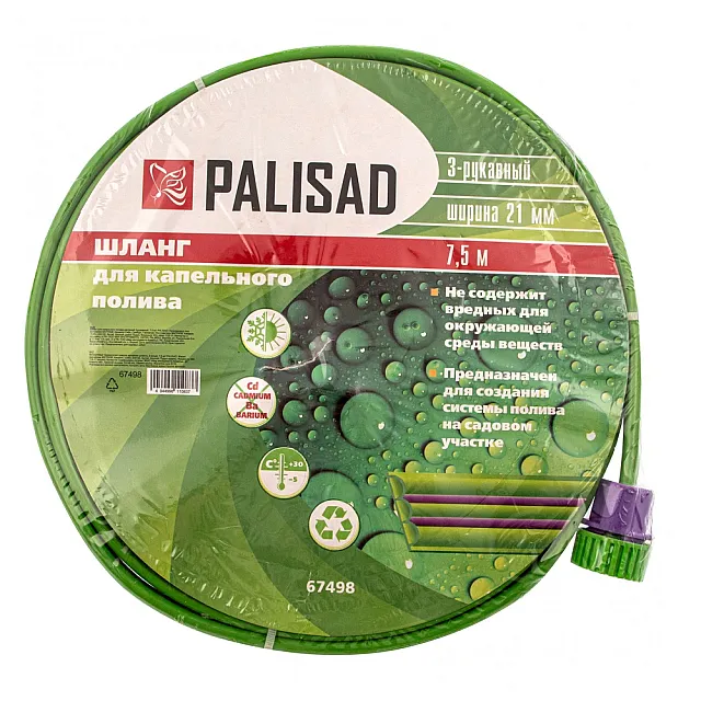 3-рукавный шланг Palisad 67498 длиной 7,5 м применяется в системах с низким давлением для капельного полива растений. Используется для размещения над и под землей. Шланг значительно снижает расход воды, а полив растений при этом происходит без риска повреждения корневой системы.